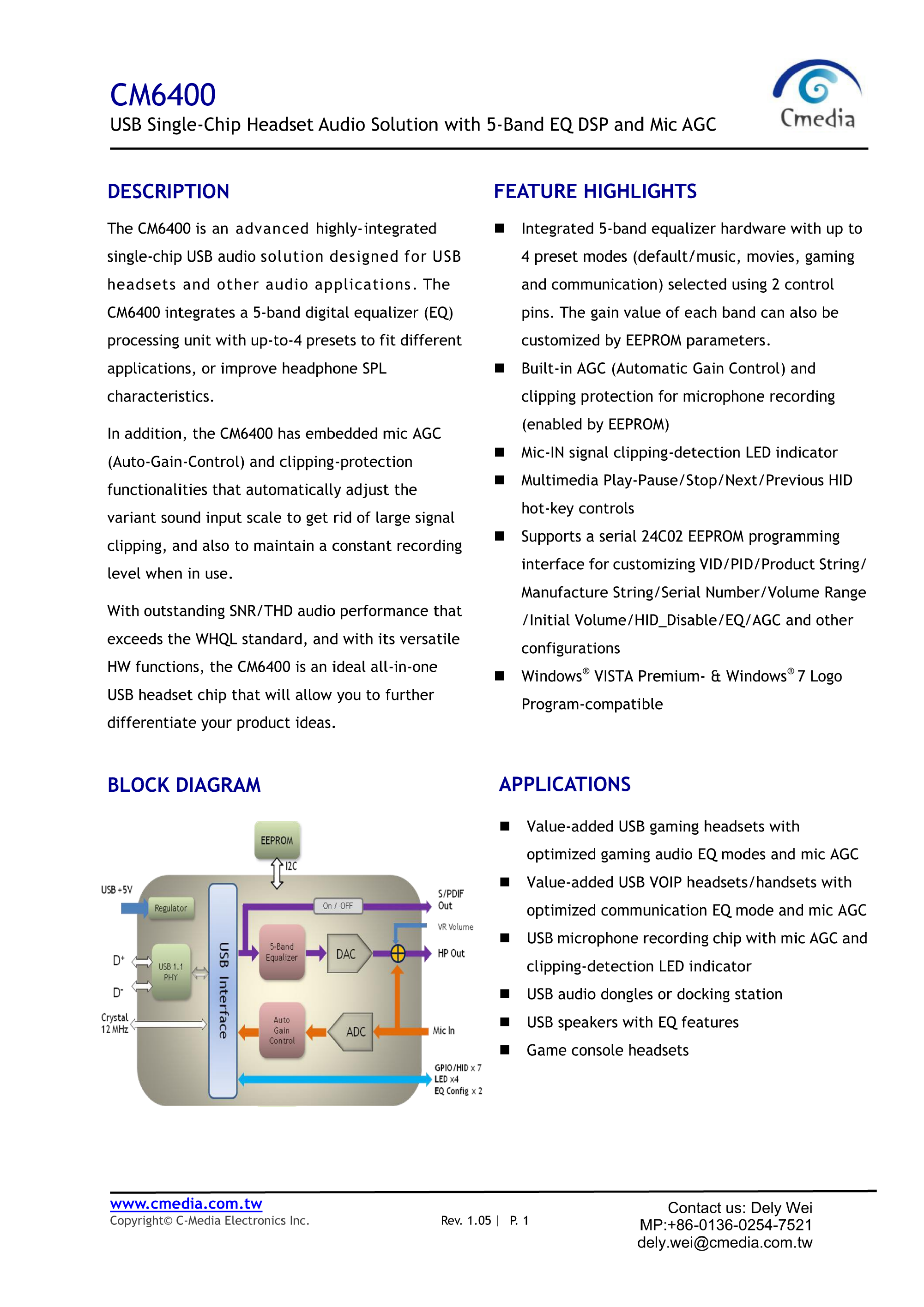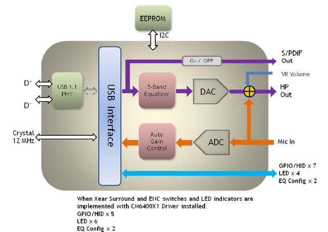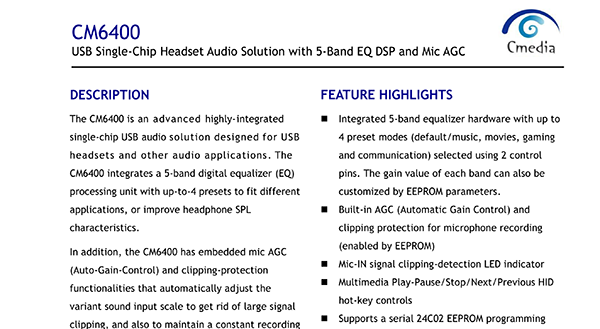 CM6400 is an advanced highly-integrated USB audio single chip optimized for featured USB headset or other audio applications. CM6400 integrates 5-band hardware digital equalizer (EQ) processing unit with up-to-4 presets to fit different applications or improve headphone SPL characteristics. In addition, embedded Mic Auto-Gain-Control (AGC) and clipping-protection functionality could automatically adjust variant sound input scale to get rid of large signal clipping and also get more constant recording level during voice communication. With outstanding SNR/THD audio performance overtaking WHQL standard and its versatile HW functions, CM6400 is the ideal all-in-one USB headset chip that could empower and differentiate your product ideas at your own will.