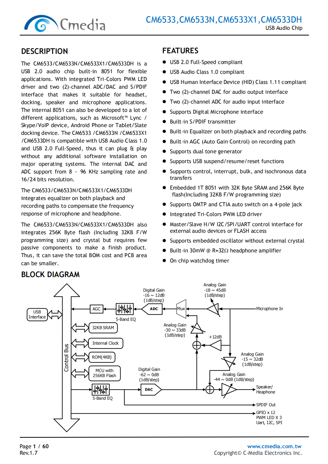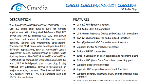 The CM6533X1 is a USB 2.0 audio chip built-in 8051 for flexible applications. With integrated Tri-Colors PWM LED driver and two-channel ADC/DAC and S/PDIF interface that makes it suitable for headset, docking, speaker and microphone applications. The internal 8051 can also be developed to a lot of different applications, such as Microsoft? Lync/Skype/VoIP device, Android Phone or Tablet/Slate docking device. The CM6533X1 is compatible with USB Audio Class 1.0 and USB 2.0 Full-Speed, thus it can plug & play without any additional software installation on major operating systems. The internal DAC and ADC support from 8 ~ 96 KHz sampling rate and 16/24 bits resolution.