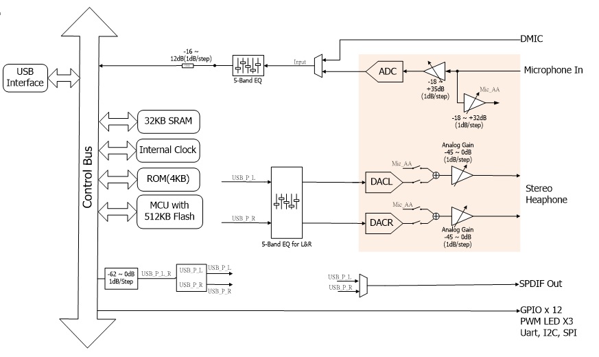 USB HID button controls such as Vol+/Vol-/Play_Pause/Next/Previous/Playback Mute/etc. could be done via GPIO pins and FW programming