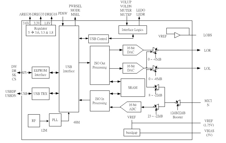 HS-100B is a highly integrated single chip USB audio solution. All essential analog modules are embedded in HS-100B, including dual DAC and headphone amplifier, ADC, microphone booster, PLL, crystal-less design, regulator, anti-pop circuitry and USB transceiver. Many features are programmable with jumper pins or external EEPROM. In addition, audio adjustment can be easily controlled via specific HID compliant volume control pins.