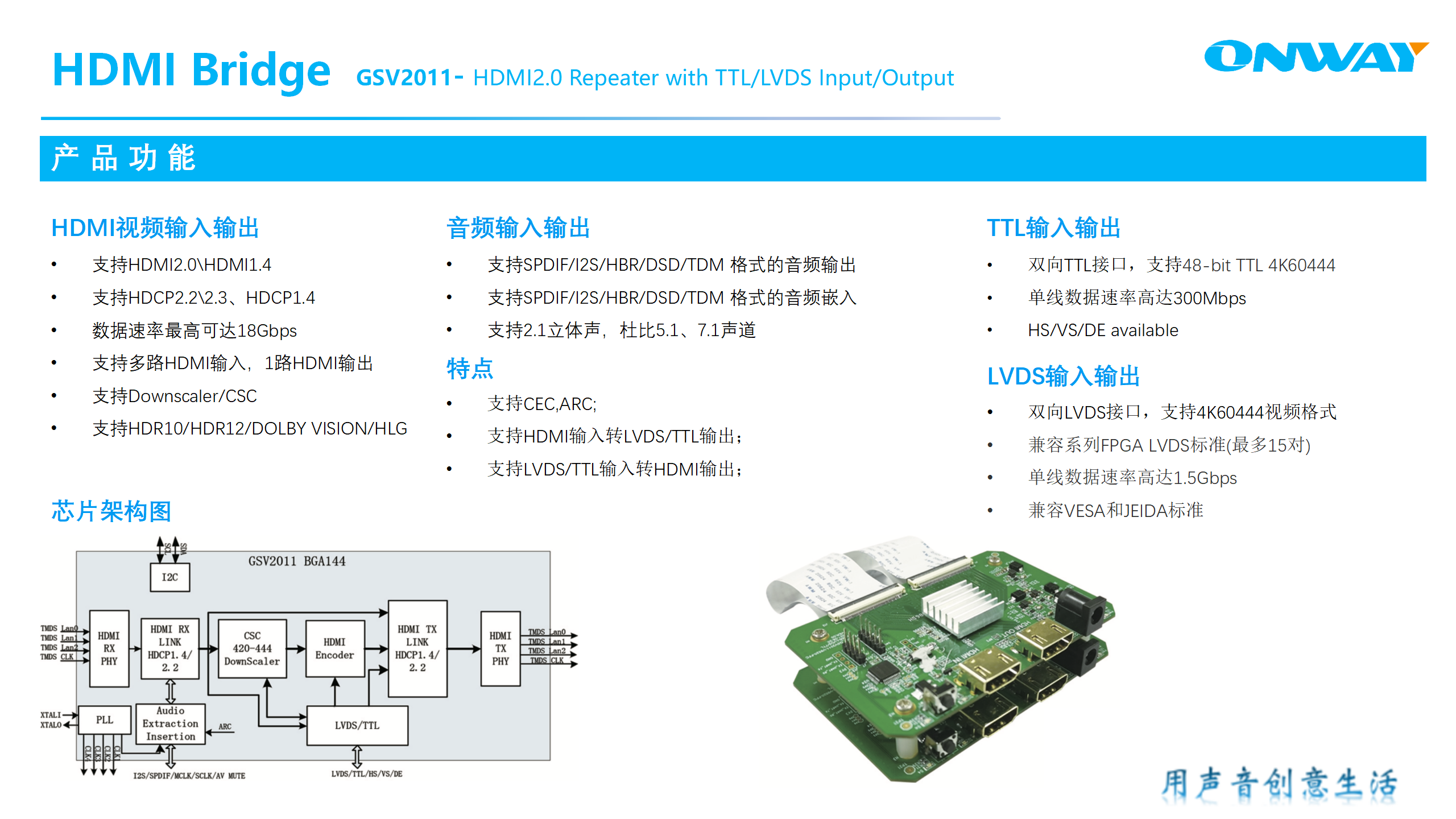 HDMI2.0 Repeater with TTL/LVDS Input/Output and Audio Extraction/Insertion
