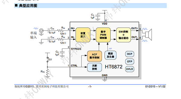 HT6872_4.7W防削頂單聲道D類音頻功率放大器