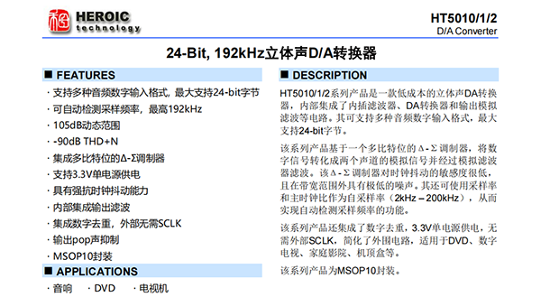 HT5010/1/2系列產(chǎn)品是一款低成本的立體聲DA轉(zhuǎn)換器,內(nèi)部集成了內(nèi)插濾波器、DA轉(zhuǎn)換器和輸出模擬濾波等電路。其可支持多種音頻數(shù)字輸入格式,最大支持24-bit字節(jié)。該系列產(chǎn)品基于一個(gè)多比特位的Δ-Σ調(diào)制器,將數(shù)字信號(hào)轉(zhuǎn)化成兩個(gè)聲道的模擬信號(hào)并經(jīng)過模擬濾波器濾波。該Δ-Σ調(diào)制器對(duì)時(shí)鐘抖動(dòng)的敏感度很低,且在帶寬范圍外具有極低的噪聲。其還可使用采樣率和主時(shí)鐘比作為自采樣率(2kHz–200kHz),從而實(shí)現(xiàn)自動(dòng)檢測(cè)采樣頻率的功能。