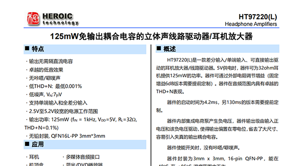 HT97220(L)是一款差分輸入/單端輸入、可直接輸出驅(qū)動的耳機放大器/線路驅(qū)動器。5V供電時,器件可為32ohm耳機提供125mW的功率。器件可通過外部電阻調(diào)節(jié)增益(固定增益6dB版本需要提前定制)。器件在音頻范圍內(nèi)具有卓越的THD+N表現(xiàn)。器件的啟動時間為4.2ms,另130ms的版本需要提前定制。器件內(nèi)部集成電荷泵產(chǎn)生負(fù)電壓,器件輸出級由輸入正電壓和該負(fù)電壓驅(qū)動,使得輸出偏置在零電位,省去了大尺寸、容易引入失真的輸出耦合電容。器件使能開關(guān)時,沒有咔嗒/噼噗聲。