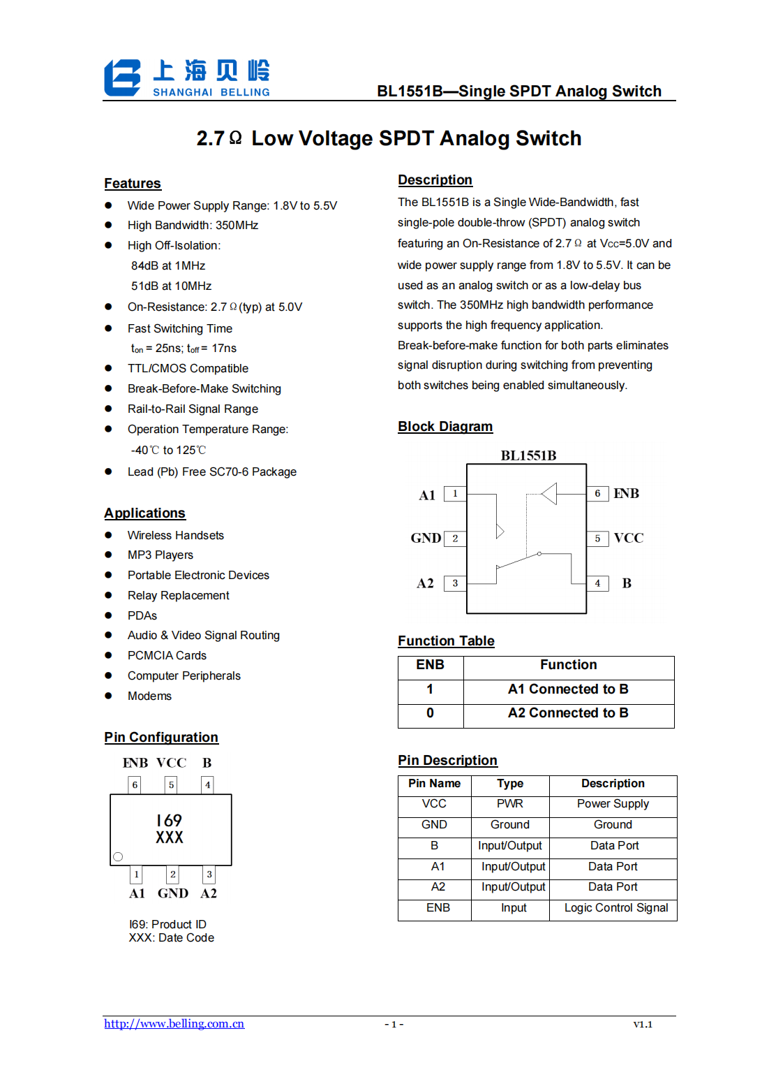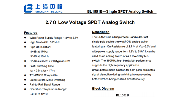 The BL1551B is a Single Wide-Bandwidth, fast single-pole double-throw (SPDT) analog switch featuring an On-Resistance of 2.7Ω at VCC=5.0V and wide power supply range from 1.8V to 5.5V