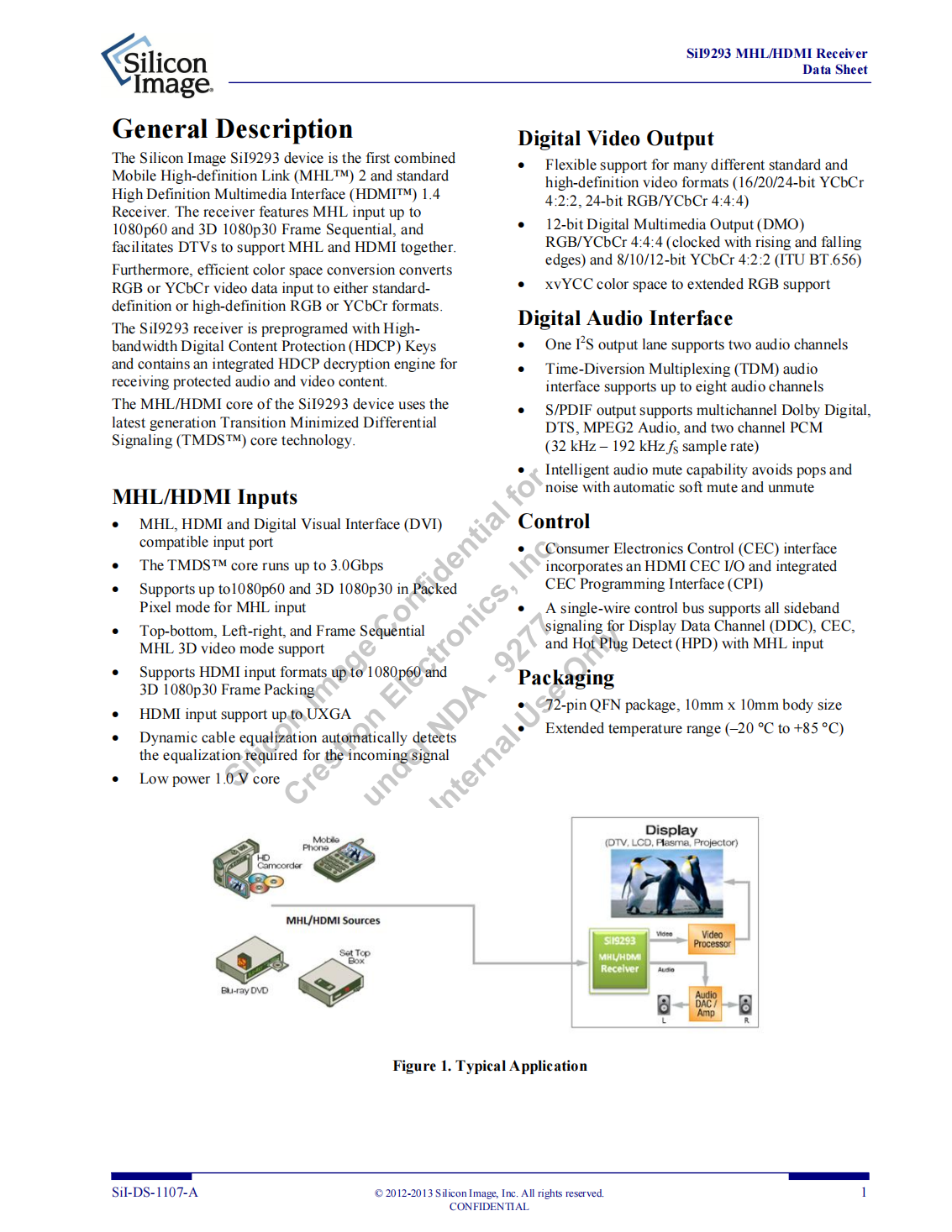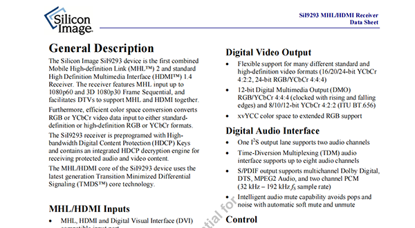 The Silicon Image SiI9293 device is the first combined Mobile High-definition Link (MHL?) 2 and standard High Definition Multimedia Interface (HDMI?) 1.4 Receiver
