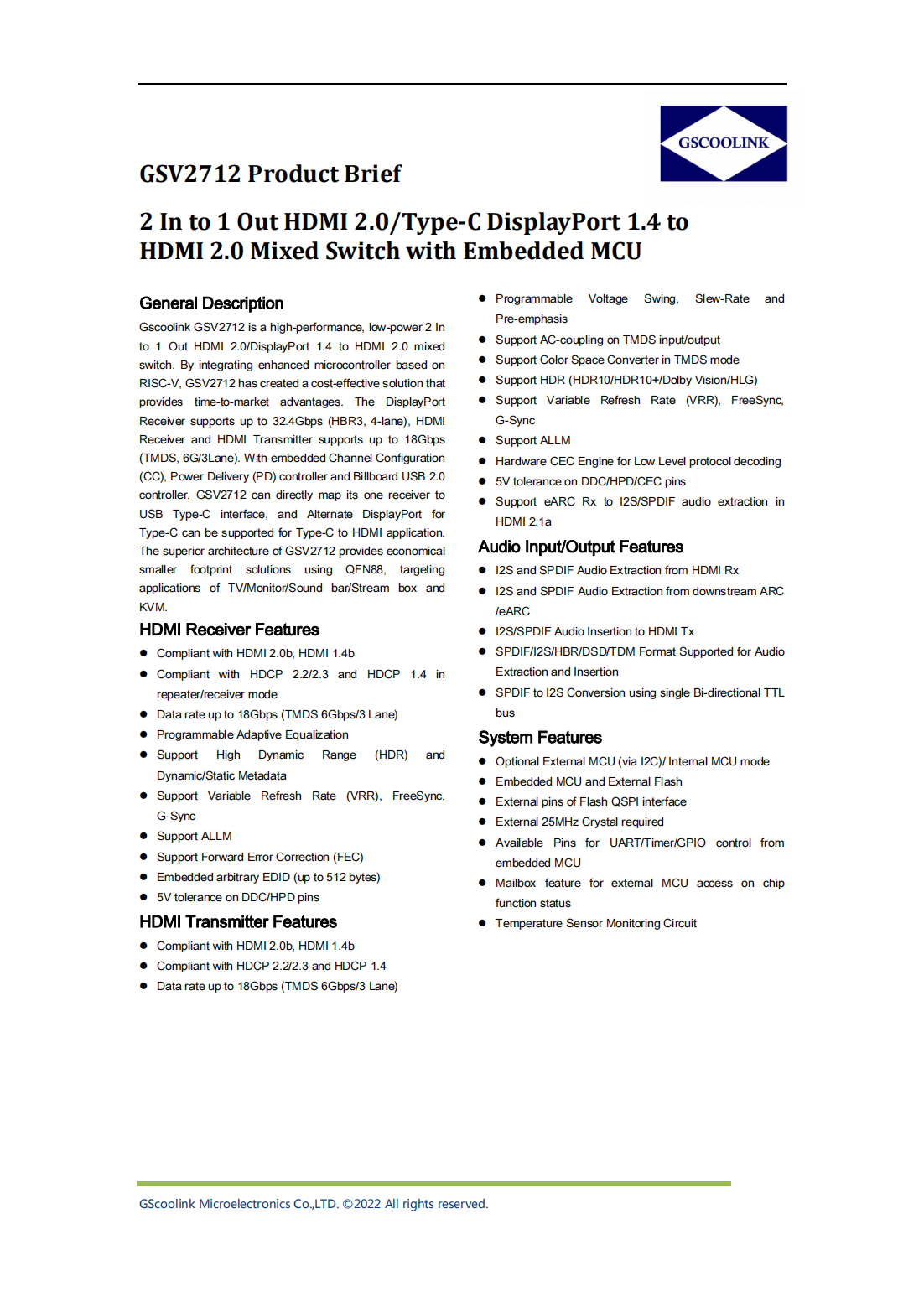 The superior architecture of GSV2712 provides economical smaller footprint solutions using QFN88,targeting applications of TV/Monitor/Sound bar/Stream box and KVM.