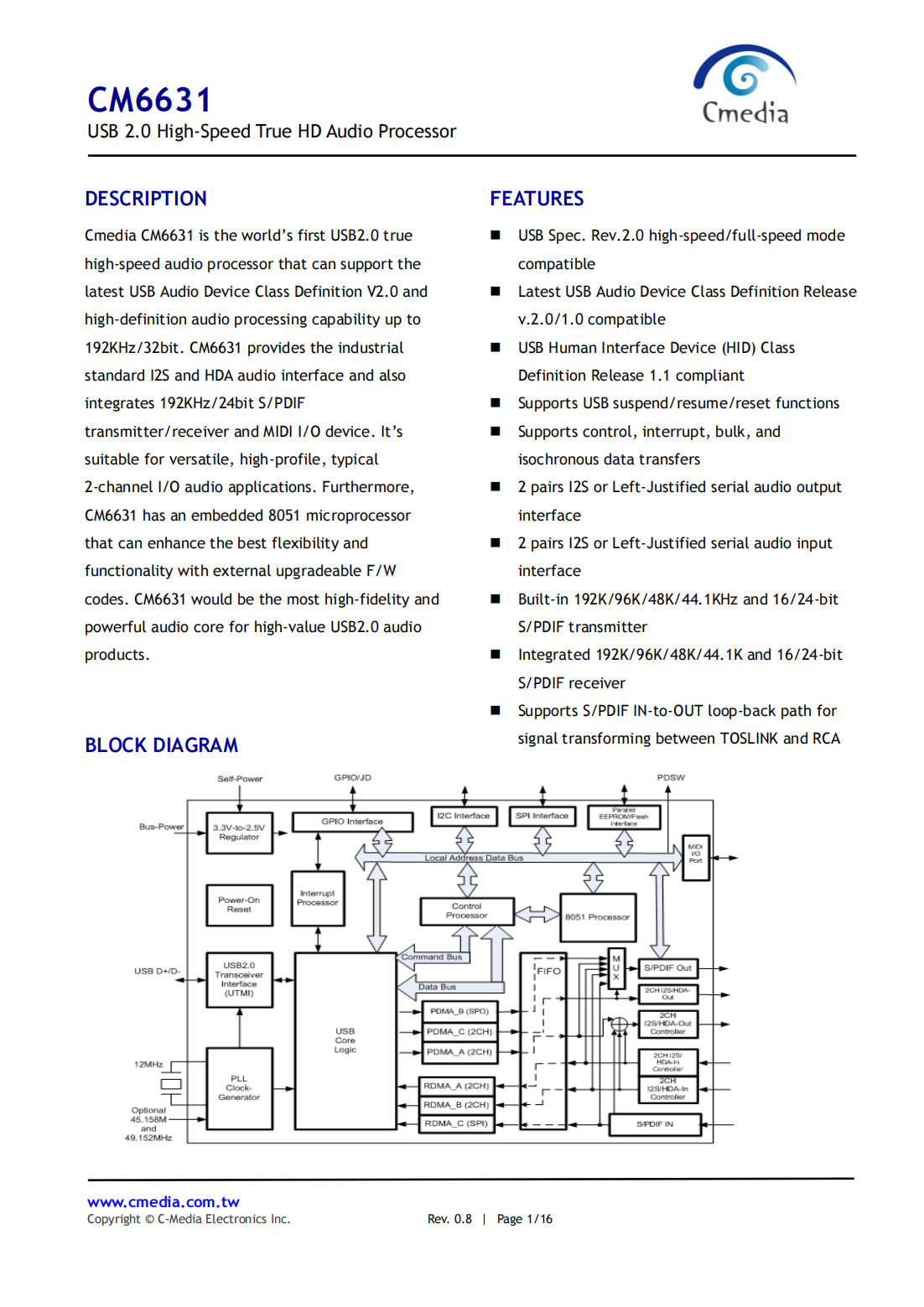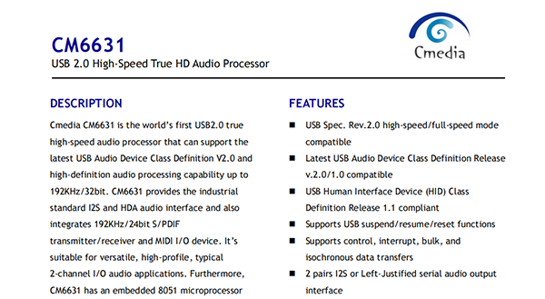 Cmedia CM6631 is the world’s first USB2.0 true high-speed audio processor that can support the latest USB Audio Device Class Definition V2.0 and high-definition audio processing capability up to 192KHz/32bit