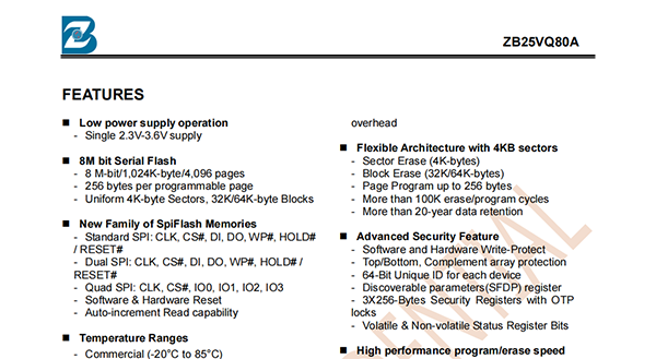 The ZB25VQ80A of non-volatile flash memory device supports the standard Serial Peripheral Interface (SPI)