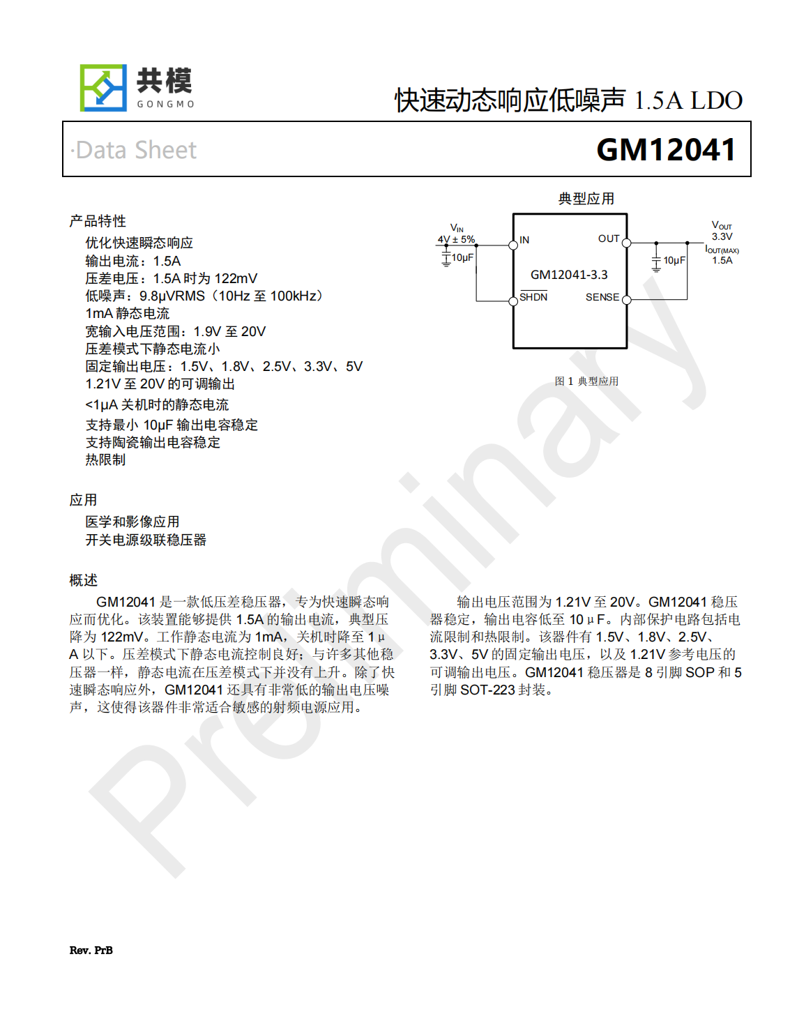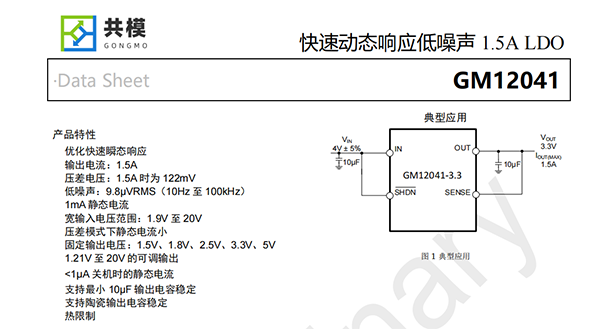 GM12041穩(wěn)壓器穩(wěn)定,輸出電容低至10μF。內(nèi)部保護電路包括電流限制和熱限制。該器件有1.5V、1.8V、2.5V、3.3V、5V的固定輸出電壓,以及1.21V參考電壓的可調(diào)輸出電壓。GM12041穩(wěn)壓器是8引腳SOP和5引腳SOT-223封裝。