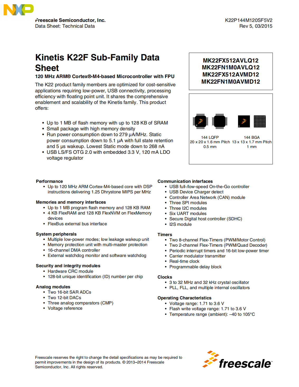 The K22 product family members are optimized for cost-sensitive applications requiring low-power, USB connectivity, processing efficiency with floating point unit. It shares the comprehensive enablement and scalability of the Kinetis family. This product offers:
