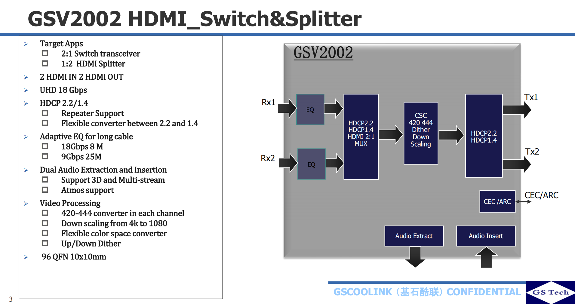 GSV2002 can support up to 8-channel I2S or 2-channel S/PDIF,3D and multi-stream audio.In TDM mode,each audio pin supports up to 8 channels.Internal Scaler and Color Space Converter enables the input and output to be timing format independent and capable of long distance transmission.With powerful HDMI Rx equalizer and Tx pre-emphasis capability,GSV2002 can cascade itself(or GSV2000 series chips)with at least 7 stages for all HDMI 1.3/1.4/2.0 timings.
