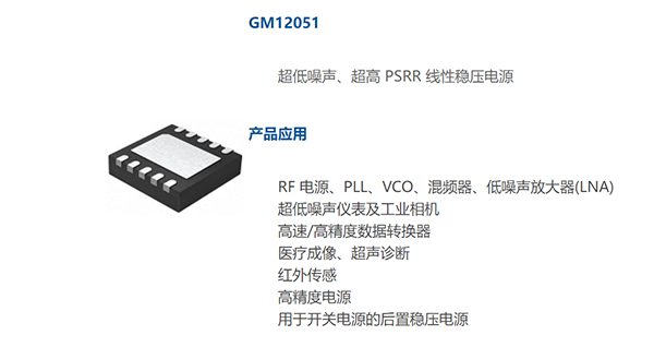 GM12051 是一款高性能低壓差線性穩(wěn)壓電源,其采用的超低噪聲和超高電源抑制比(PSRR)架構(gòu)對噪聲敏感的信號采集和無線通信應(yīng)用供電