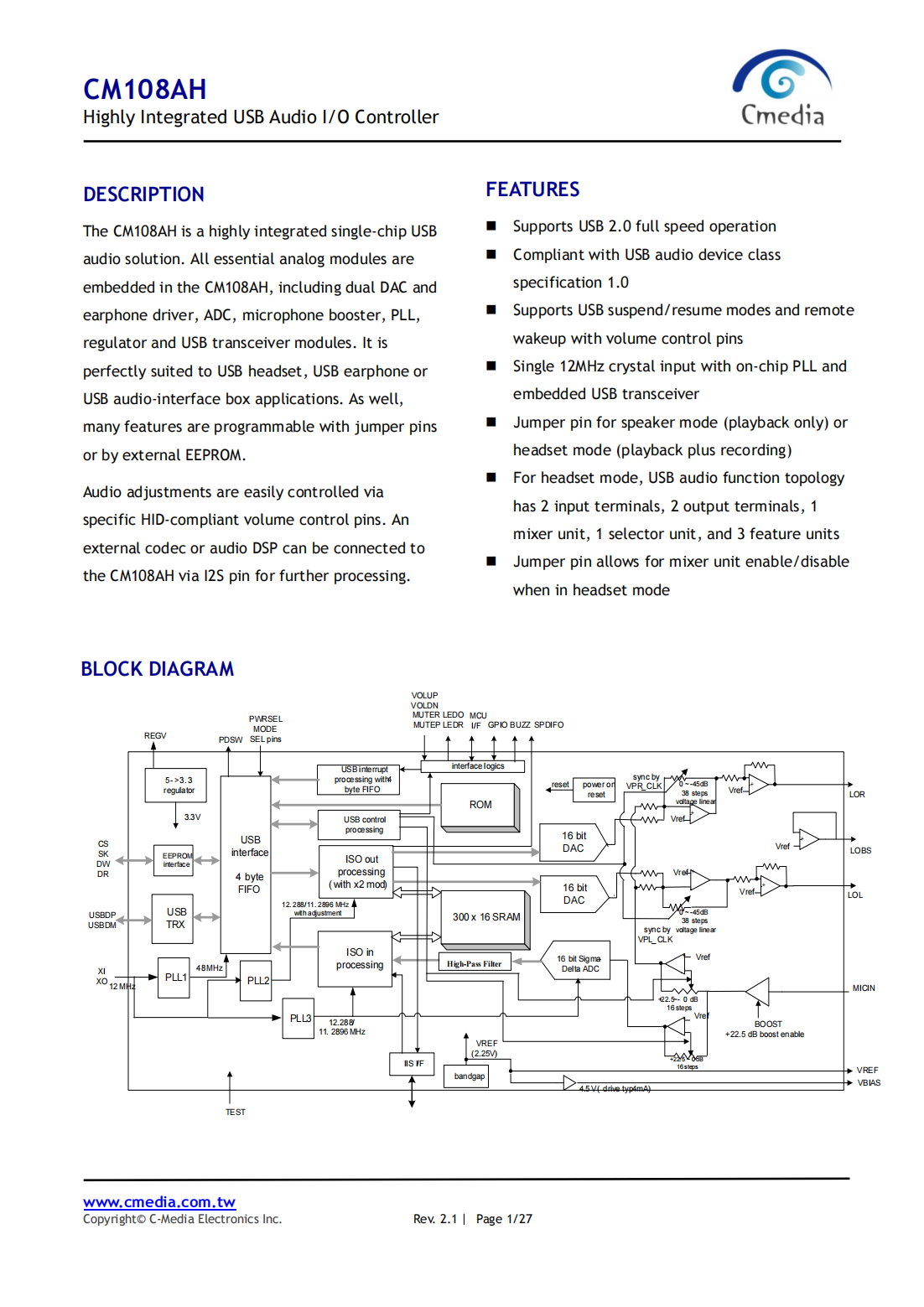 The CM108AH is a highly integrated single-chip USB audio solution.All essential analog modules are embedded in the CM108AH,including dual DAC and earphone driver,ADC,microphone booster,PLL,regulator and USB transceiver modules.It is perfectly suited to USB headset,USB earphone or USB audio-interface box applications.As well,