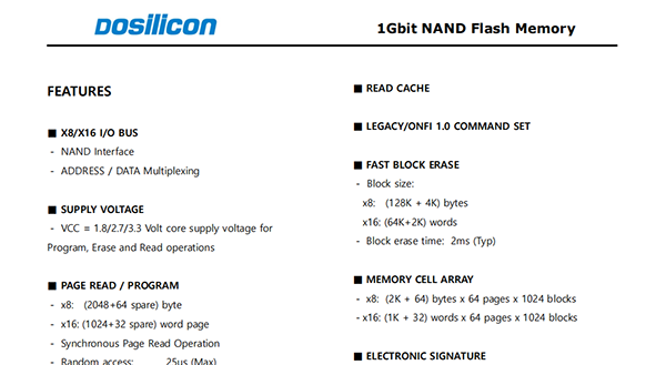 FMND1GXXXXX is a 128Mx8bit with spare 4Mx8(x8),64Mx16bit with spare 2Mx16(x16)bit capacity.The device is offered in 3.3/1.8 Vcc Power Supply,and with x8 and x16 I/O interface.The memory is divided into blocks that can be erased independently so it is possible to preserve valid data while old data is erased.