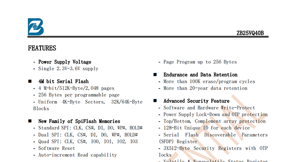The ZB25VQ40B of non-volatile flash memory device supports the standard Serial Peripheral Interface(SPI).Traditional SPI single bit serial input and output(Single I/O or SIO)is supported as well as optional two bit(Dual I/O or DIO)and four bit(quad I/O)serial protocols.This multiple width interface is called SPI Multi-I/O or MIO.