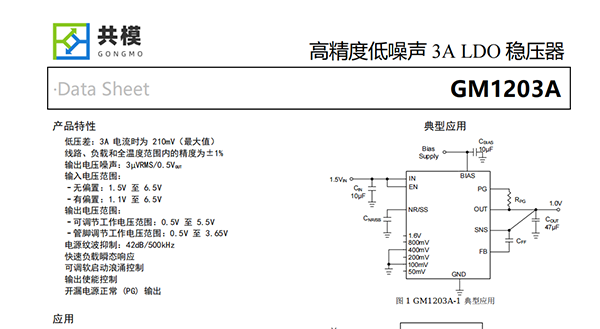 GM1203A是一款低噪聲、低壓差線性穩(wěn)壓器(LDO),可提供3A輸出電流,最大壓降僅為210mV。該器件提供兩種輸出電壓范圍。GM1203A的輸出電壓可在0.5V至3.65V范圍內(nèi)以50mV的分辨率通過(guò)引腳進(jìn)行編程,也可通過(guò)外部電阻分壓器在0.5V至5.5V范圍內(nèi)進(jìn)行調(diào)節(jié)。
