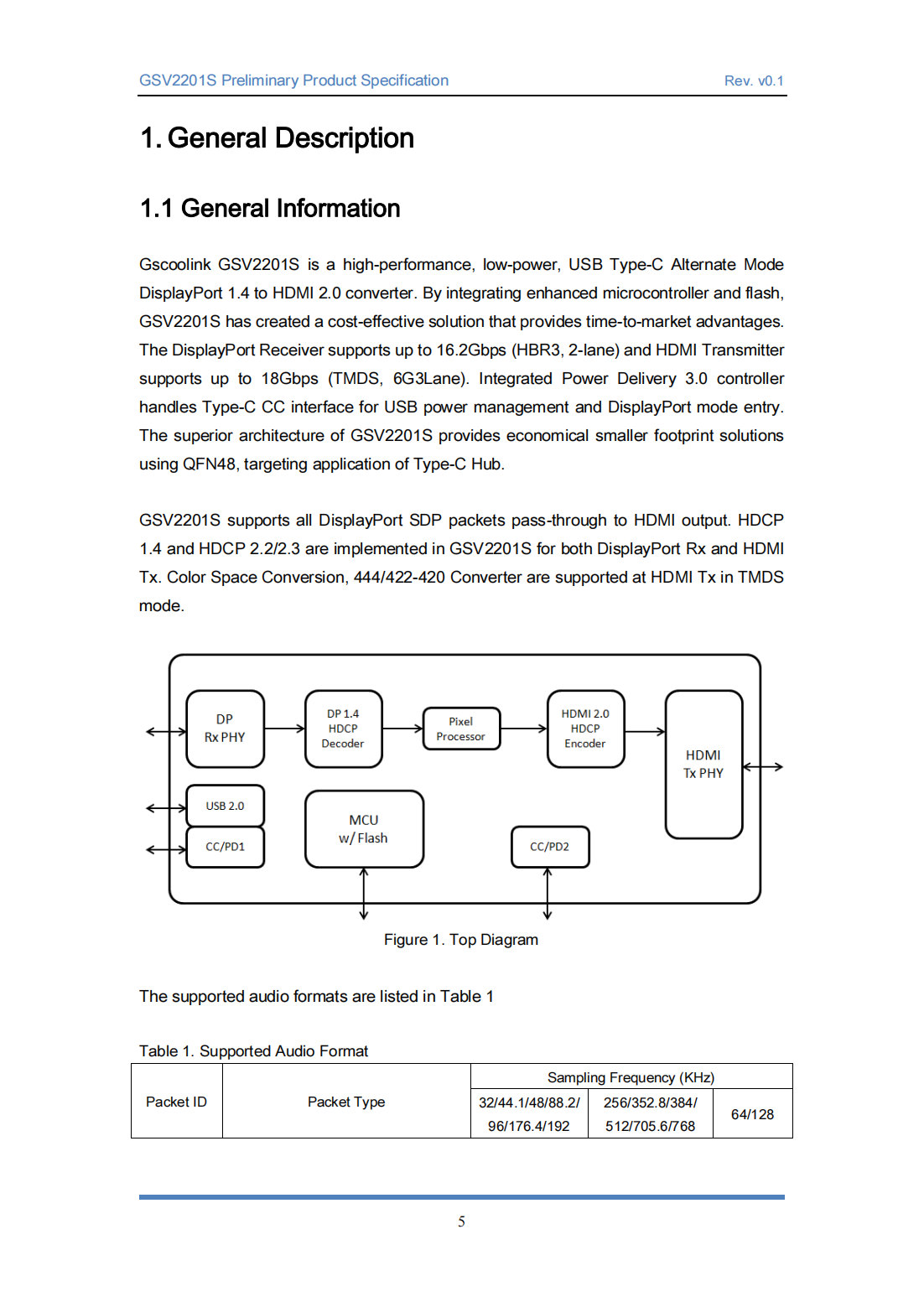 The superior architecture of GSV2201S provides economical smaller footprint solutionsusing QFN48,targeting application of Type-C Hub.GSV2201S supports all DisplayPort SDP packets pass-through to HDMI output.HDCP 1.4 and HDCP 2.2/2.3 are implemented in GSV2201S for both DisplayPort Rx and HDMI Tx.Color Space Conversion,444/422-420 Converter are supported at HDMI Tx in TMDS mode.