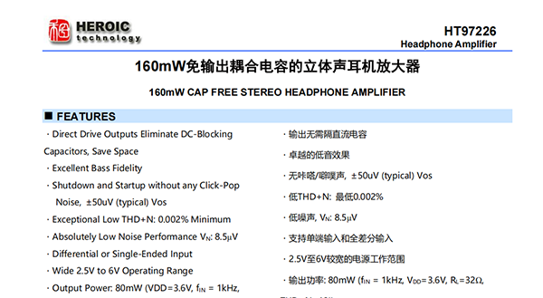 HT97226是一款差分輸入/單端輸入、可直接輸出驅(qū)動的耳機(jī)放大器。5V供電時(shí),器件可為32ohm耳機(jī)提供180mW的功率。器件可通過外部電阻調(diào)節(jié)增益。器件在音頻范圍內(nèi)具有卓越的THD+N表現(xiàn)。