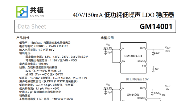 GM14001穩(wěn)壓器輸出噪聲為15μVRMS,與5V及以下的固定選項(xiàng)輸出電壓無關(guān)。