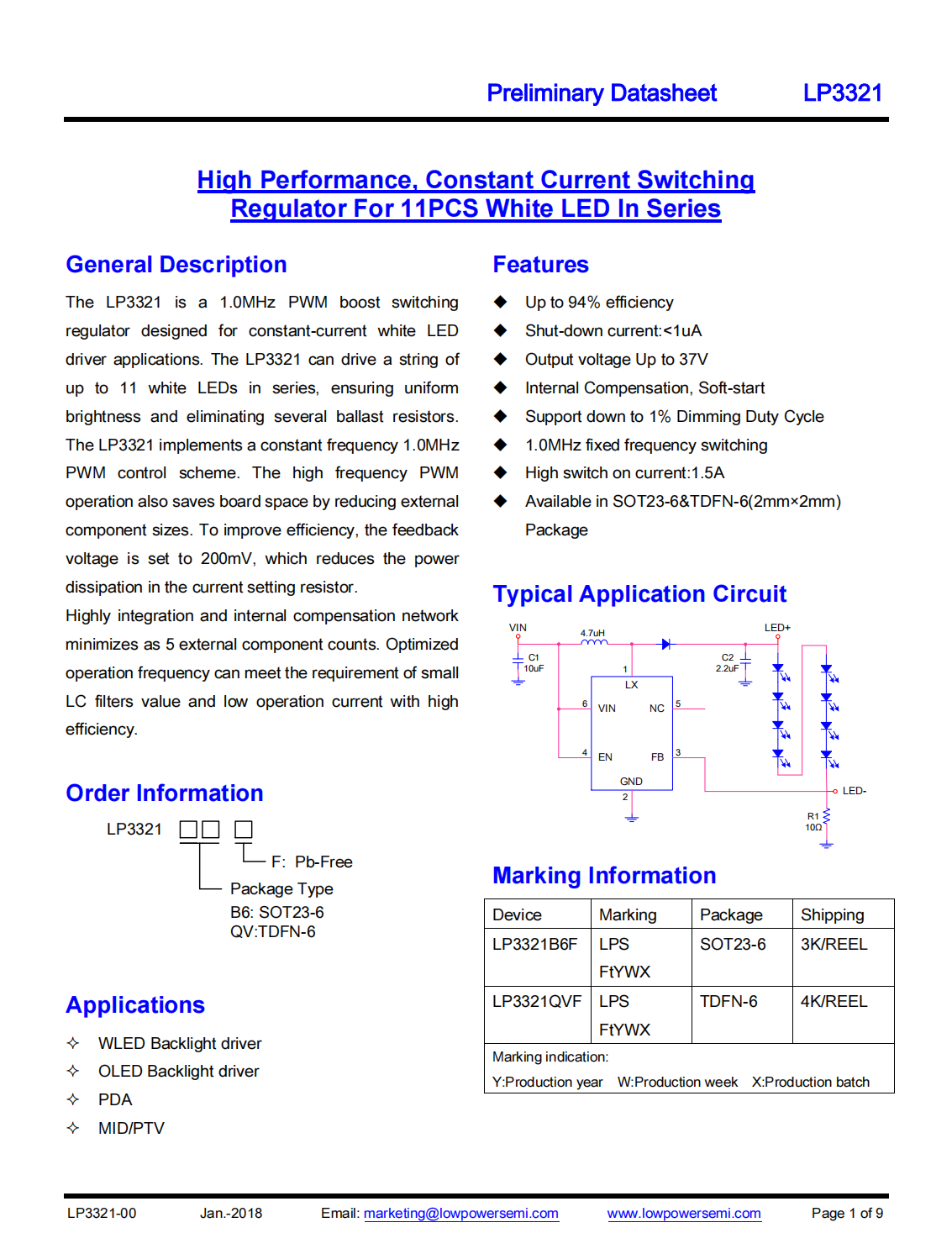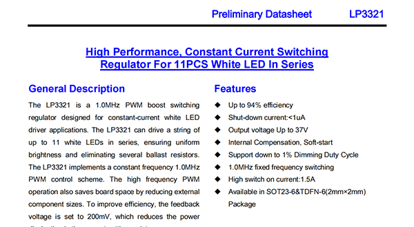 The LP3321 is a 1.0MHz PWM boost switching regulator designed for constant-current white LED driver applications.The LP3321 can drive a string of up to 11 white LEDs in series,ensuring uniform brightness and eliminating several ballast resistors.