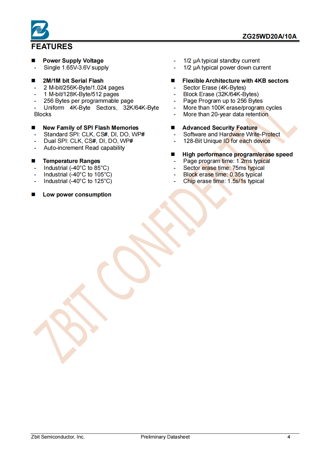 The ZG25WD20A/10A of non-volatile flash memory device supports the standard Serial PeripheralInterface (SPI). Traditional SPI single bit serial input and output (Single I/O or SIO) is supported as well asoptional two bit (Dual I/O or DIO) serial protocols. This multiple width interface is called SPI Multi-I/O or MIO.