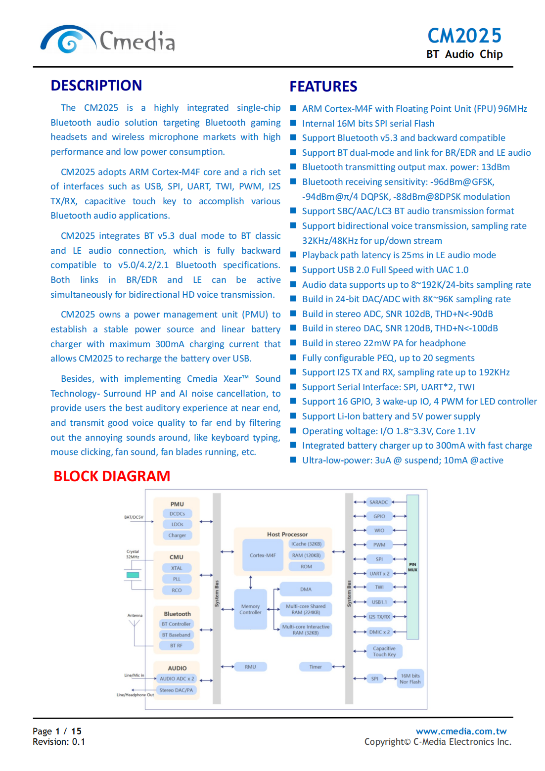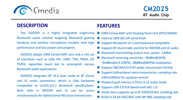 CM2025是一款高度集成的單芯片藍(lán)牙音頻解決方案,針對(duì)藍(lán)牙游戲耳機(jī)和無(wú)線麥克風(fēng)市場(chǎng),具有高性能和低功耗。