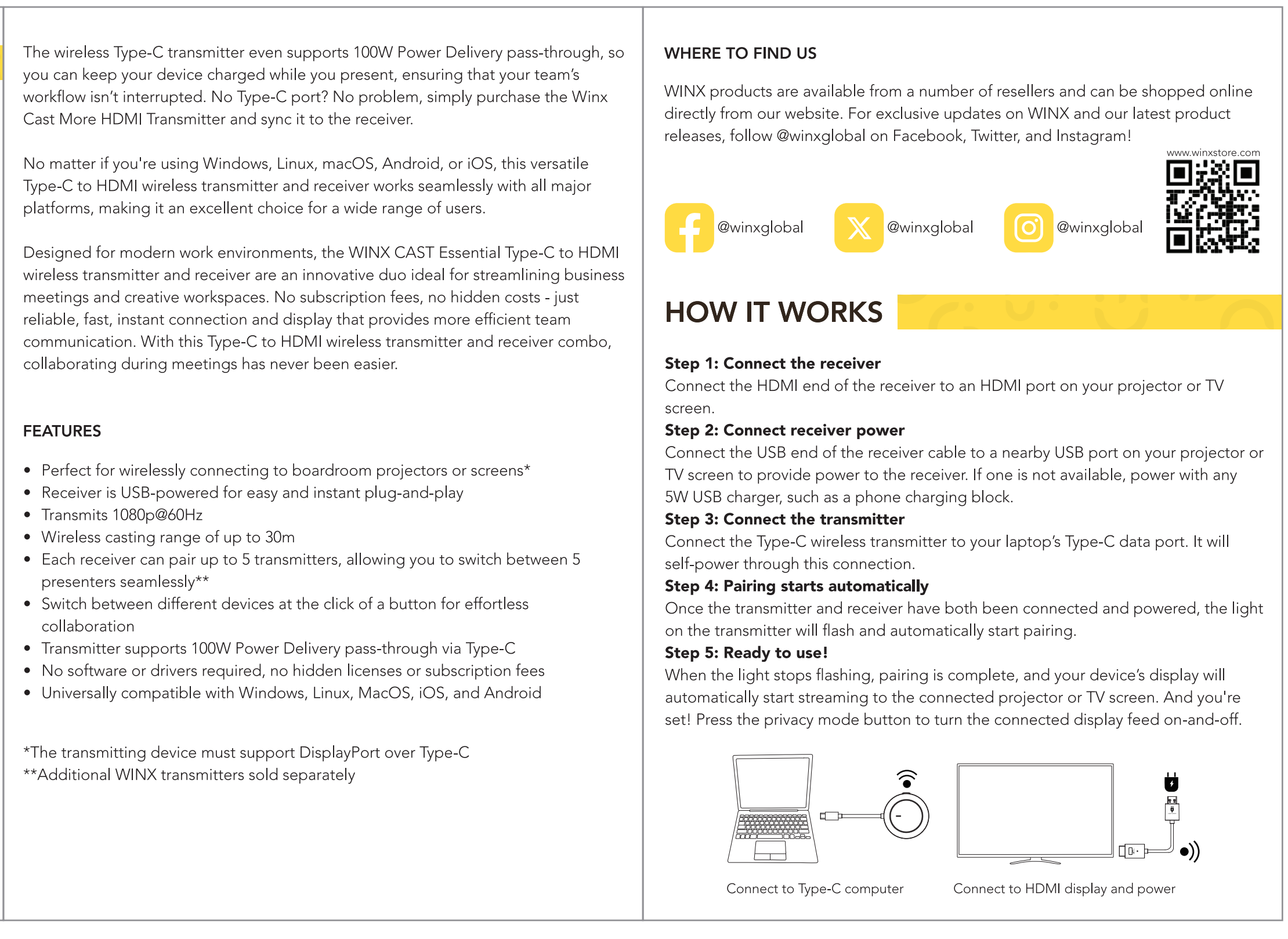With crisp 1080p@60Hz resolution and a range of up to 30 barrier-free metres, thiswireless HDMl transmitter delivers smooth, quality video and audio thanks to built-in5GHz WiFi connectivity.