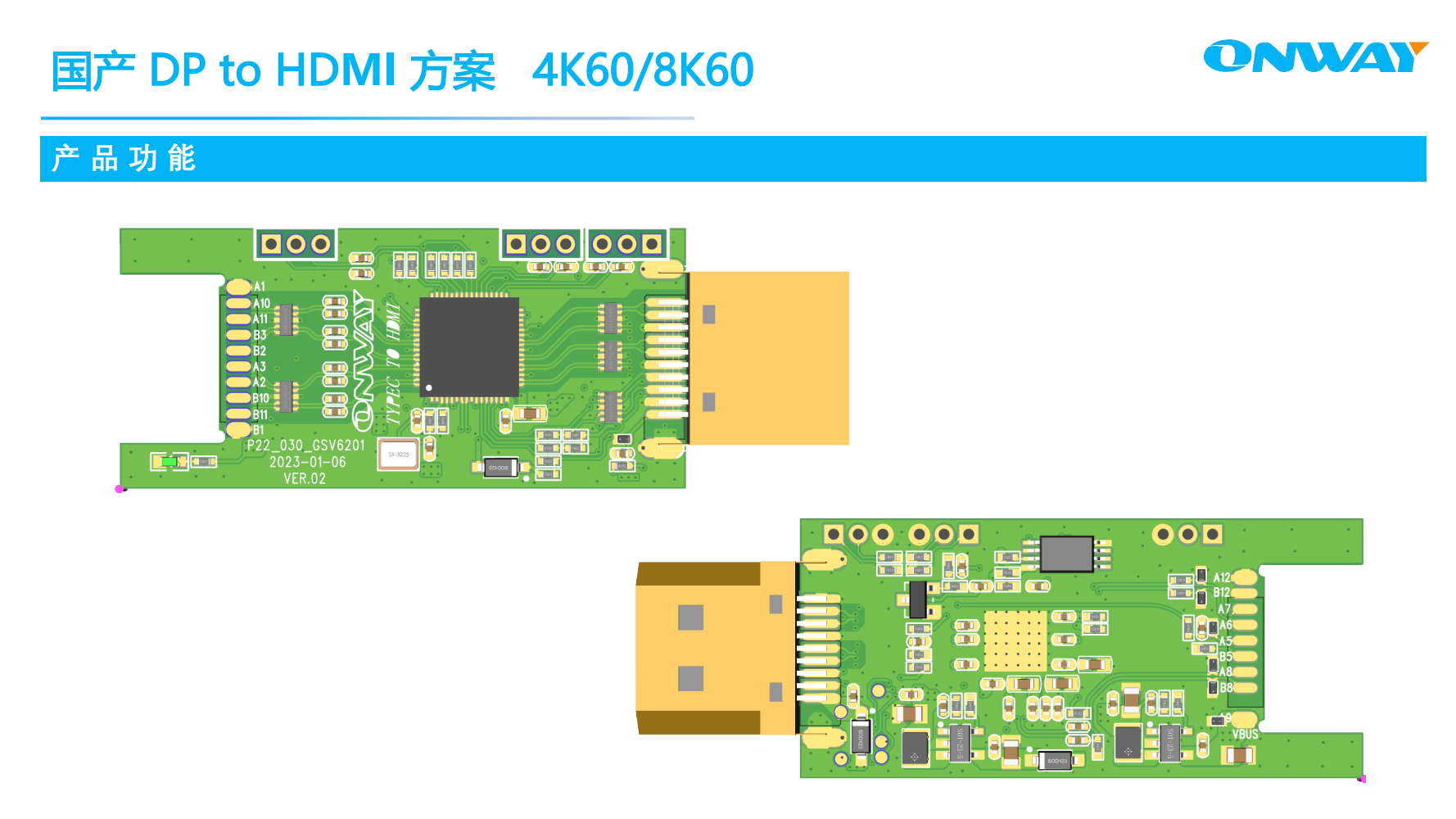 The DisplayPort Receiver supports up to 32.4Gbps(HBR3,4-lane)and HDMI Transmitter supports up to 18Gbps(TMDS,6G3Lane).Integrated Power Delivery 3.0 controller handles Type-C CC interface for USB power management and DisplayPort mode entry.