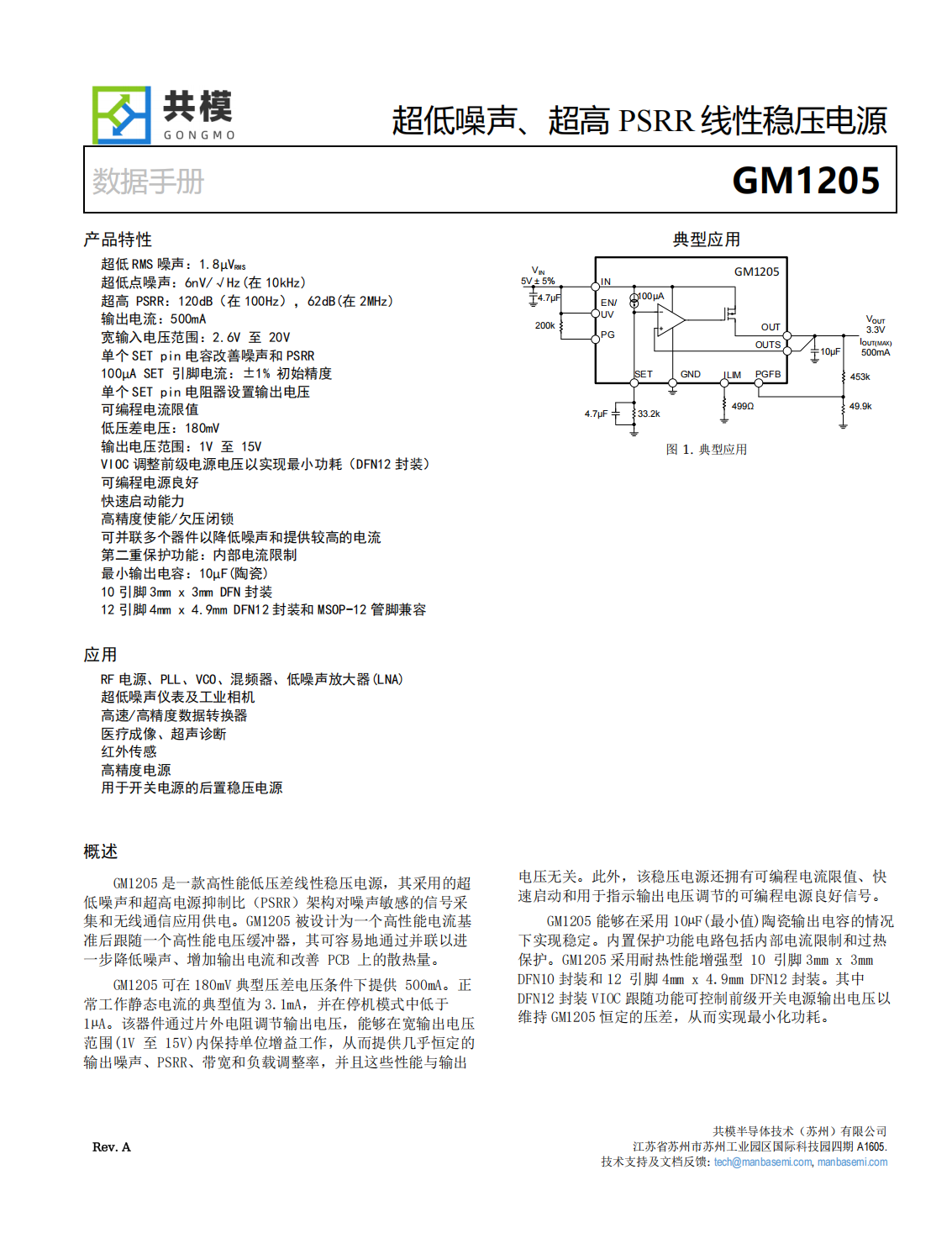 GM1205是一款高性能低壓差線性穩(wěn)壓電源,其采用的超低噪聲和超高電源抑制比(PSRR)架構(gòu)對噪聲敏感的信號采集和無線通信應(yīng)用供電。GM1205被設(shè)計為一個高性能電流基準(zhǔn)后跟隨一個高性能電壓緩沖器,其可容易地通過并聯(lián)以進(jìn)一步降低噪聲、增加輸出電流和改善PCB上的散熱量。