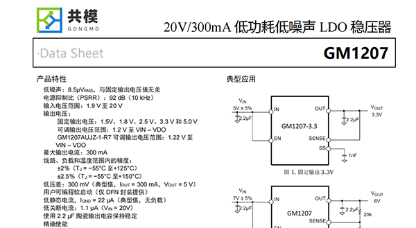 GM1207提供6種固定輸出電壓選項?,F(xiàn)有庫存提供下列電壓版本:1.2V(可調(diào)節(jié))、1.22V(可調(diào)節(jié))、1.5V、1.8V、2.5V、3.3V和5.0V。每個固定輸出電壓都可以通過外部反饋分壓器在初始設(shè)定點以上調(diào)整。這使GM1207可提供1.2V至VIN?VDO的輸出電壓且具有高PSRR和低噪聲。