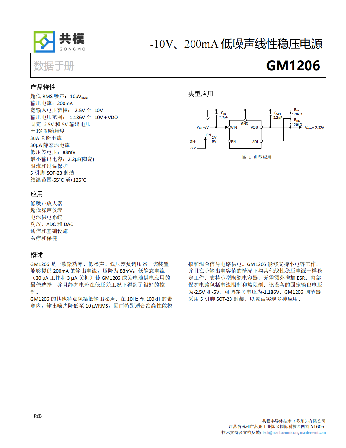 GM1206是一款微功率、低噪聲、低壓差負調壓器。該裝置能夠提供200mA的輸出電流,壓降為88mV。低靜態(tài)電流(30μA工作和3μA關機)使GM1206成為電池供電應用的最佳選擇,并且靜態(tài)電流在低壓差工況下得到了很好的控制。