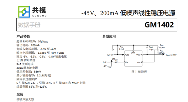 GM1402的其他特點包括低輸出噪聲。在10Hz至100kH的帶寬內(nèi),輸出噪聲降低至10μVRMS,因而特別適合給高性能模擬和混合信號電路供電。GM1402能夠支持小電容工作,并且在小輸出電容值的情況下與其他線性穩(wěn)壓電源一樣穩(wěn)定工作。支持小型陶瓷電容器,無需額外增加ESR。內(nèi)部保護電路包括電流限制和熱限制。該設(shè)備的固定輸出電壓為工廠設(shè)定,包含-5V,-3.3V,-2.5V,-1.8V等,可調(diào)參考電壓為-1.186V或-1.22V。GM1402調(diào)節(jié)器采用5引腳SOT-23、6引腳DFN、8引腳DFN和8引腳MSOP封裝,以靈活實現(xiàn)多種應(yīng)用。