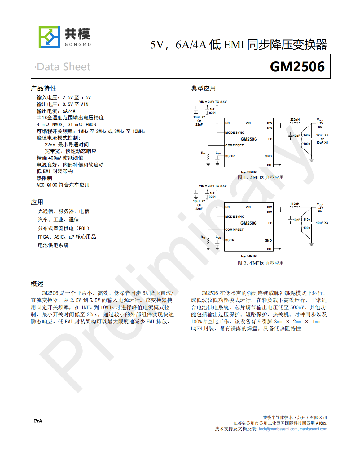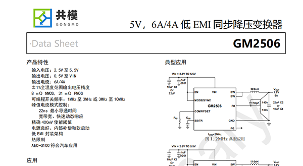 GM2506是一個非常小、高效、低噪音同步6A降壓直流/直流變換器,從2.5V到5.5V的輸入電源運(yùn)行。該變換器使用固定開關(guān)頻率,在1MHz到10MHz時進(jìn)行峰值電流模式控制,最小開關(guān)時間低至22ns,通過較小的外部組件實(shí)現(xiàn)快速瞬態(tài)響應(yīng)。低EMI封裝架構(gòu)可以最大限度地減少EMI排放。