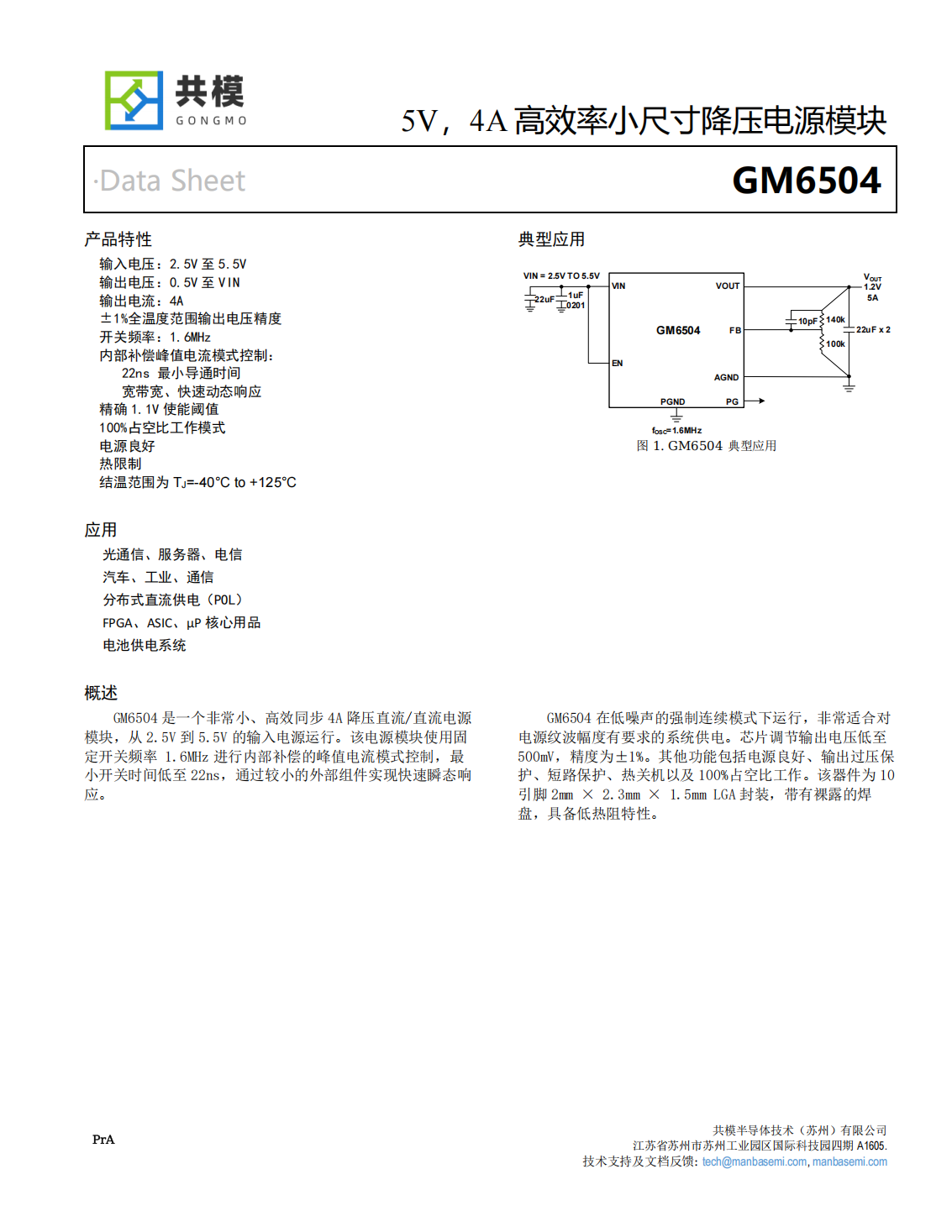GM6504是一個(gè)非常小、高效同步4A降壓直流/直流電源模塊,從2.5V到5.5V的輸入電源運(yùn)行。該電源模塊使用固定開(kāi)關(guān)頻率1.6MHz進(jìn)行內(nèi)部補(bǔ)償?shù)姆逯惦娏髂J娇刂?,最小開(kāi)關(guān)時(shí)間低至22ns,通過(guò)較小的外部組件實(shí)現(xiàn)快速瞬態(tài)響應(yīng)。