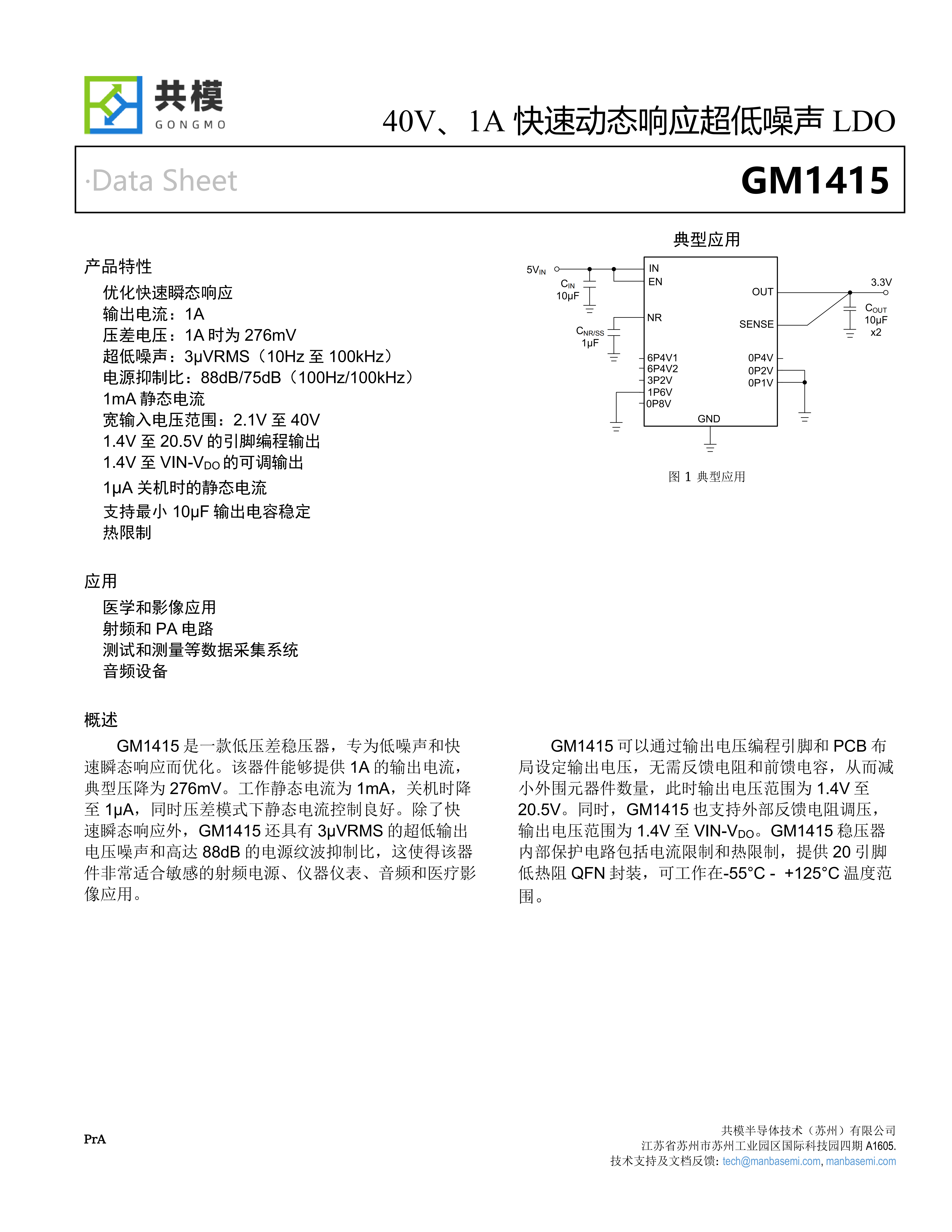 GM1415 是一款低壓差穩(wěn)壓器,專為低噪聲和快 速瞬態(tài)響應(yīng)而優(yōu)化