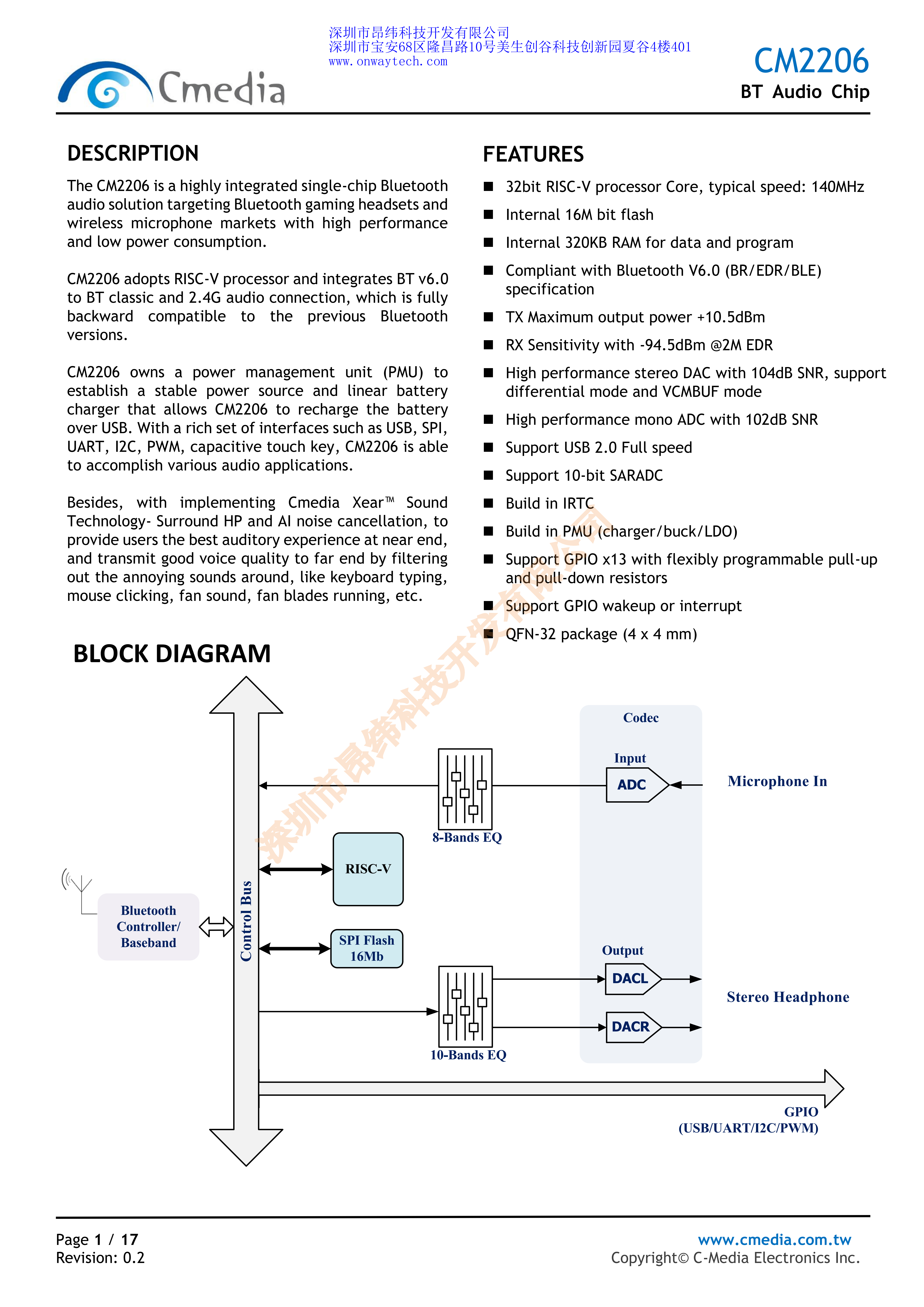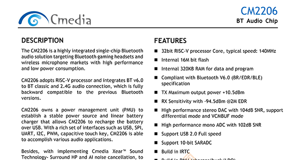 CM2206是一款高度集成的單片藍(lán)牙芯片,針對藍(lán)牙游戲耳機(jī)的音頻解決方案