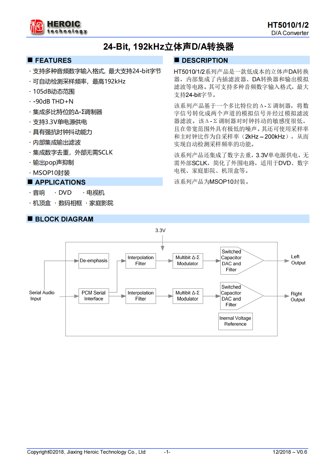 HT5010/1/2系列產(chǎn)品是一款低成本的立體聲DA轉(zhuǎn)換器,內(nèi)部集成了內(nèi)插濾波器、DA轉(zhuǎn)換器和輸出模擬濾波等電路。其可支持多種音頻數(shù)字輸入格式,最大支持24-bit字節(jié)。該系列產(chǎn)品基于一個(gè)多比特位的Δ-Σ調(diào)制器,將數(shù)字信號(hào)轉(zhuǎn)化成兩個(gè)聲道的模擬信號(hào)并經(jīng)過模擬濾波器濾波。該Δ-Σ調(diào)制器對(duì)時(shí)鐘抖動(dòng)的敏感度很低,且在帶寬范圍外具有極低的噪聲。其還可使用采樣率和主時(shí)鐘比作為自采樣率(2kHz–200kHz),從而實(shí)現(xiàn)自動(dòng)檢測(cè)采樣頻率的功能。
