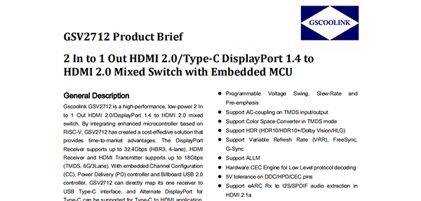 Gscoolink GSV2712 is a high-performance,low-power 2 In to 1 Out HDMI 2.0/DisplayPort 1.4 to HDMI 2.0 mixed switch.By integrating enhanced microcontroller based on RISC-V,GSV2712 has created a cost-effective solution that provides time-to-market advantages.The DisplayPort Receiver supports up to 32.4Gbps(HBR3,4-lane),HDMI Receiver and HDMI Transmitter supports up to 18Gbps(TMDS,6G/3Lane).With embedded Channel Configuration(CC),Power Delivery(PD)controller and Billboard USB 2.0 controller,GSV2712 can directly map its one receiver to USB Type-C interface,and Alternate DisplayPort for Type-C can be supported for Type-C to HDMI application.