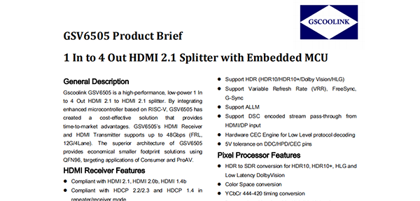 ·Gscoolink GSV6505是一款高性能、低功耗的、1-IN-4-OUT、HDMI2.1 To HDMI2.1分配器。