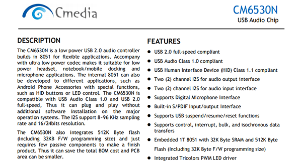The CM6530N is a low power USB 2.0 audio controller builds in 8051 for flexible applications. Accompany with ultra low power codec makes it suitable for low power headset, notebook/mobile docking and microphone applications