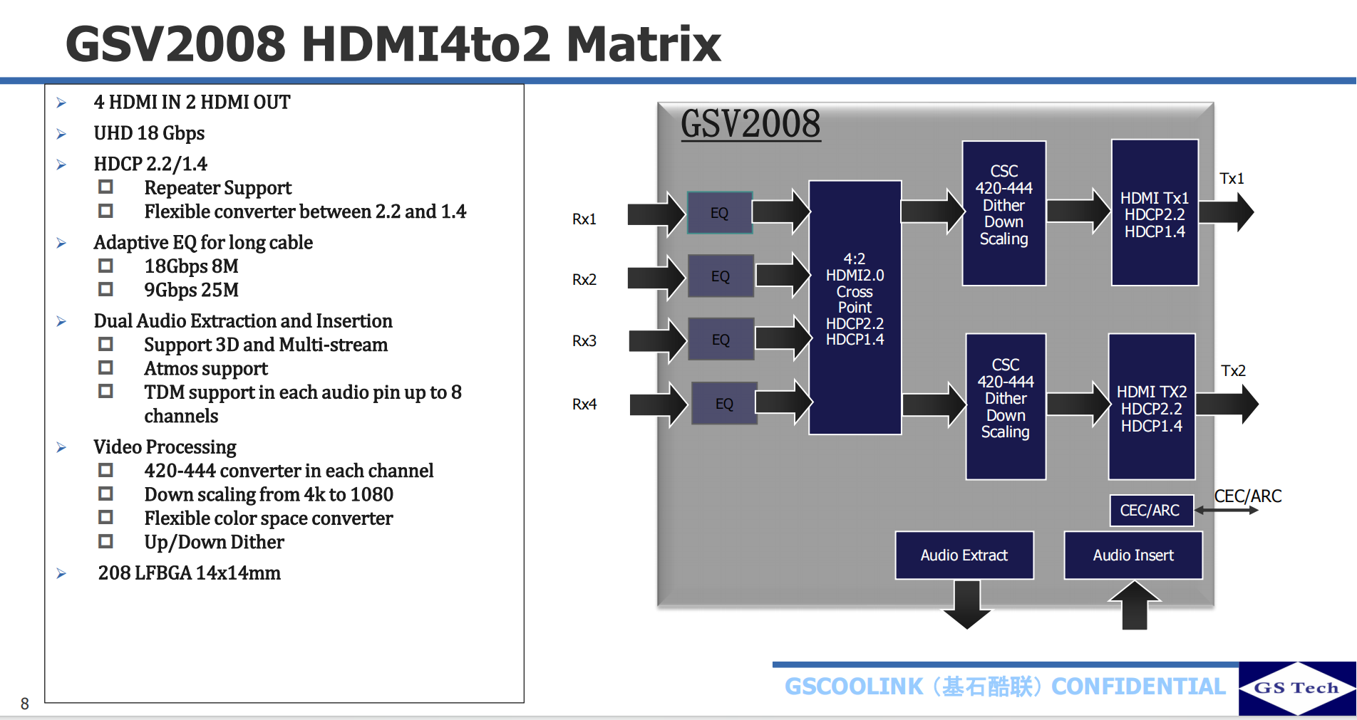 GSV2008是HDMI2.0/HDCP2.2 4x2矩陣,支持DownScaler,CSC及音頻分離和音頻嵌入,支持ARC及CEC功能。
