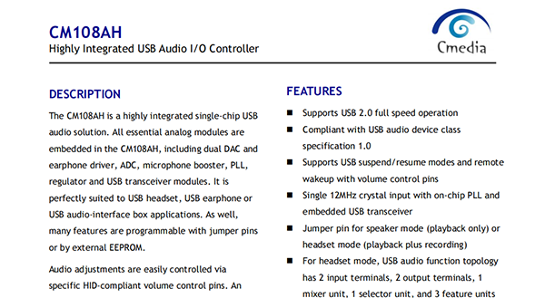 The CM108AH is a highly integrated single-chip USB audio solution.All essential analog modules are embedded in the CM108AH,including dual DAC and earphone driver,ADC,microphone booster,PLL,regulator and USB transceiver modules.It is perfectly suited to USB headset,USB earphone or USB audio-interface box applications.As well,