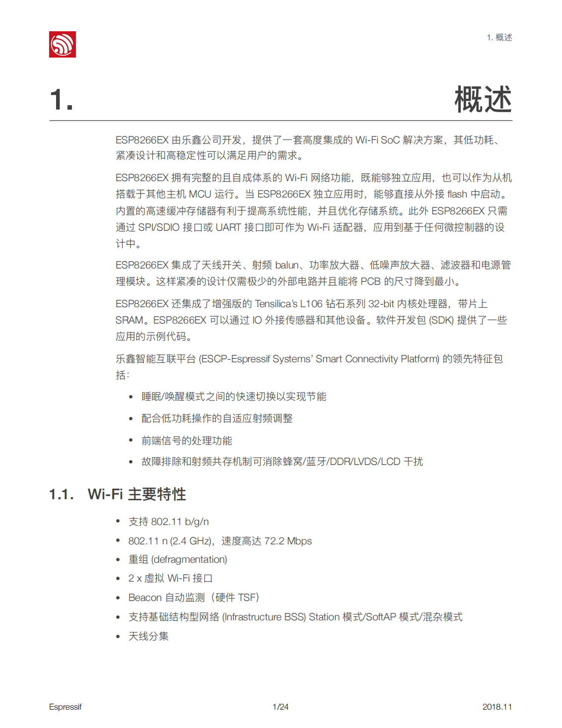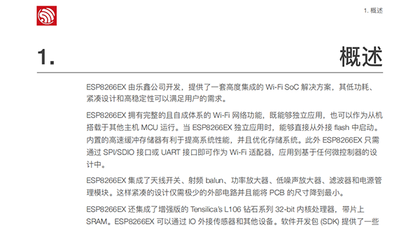ESP8266EX由樂鑫公司開發(fā),提供了?套?度集成的Wi-Fi SoC解決?案,其低功耗、緊湊設(shè)計(jì)和?穩(wěn)定性可以滿??戶的需求。