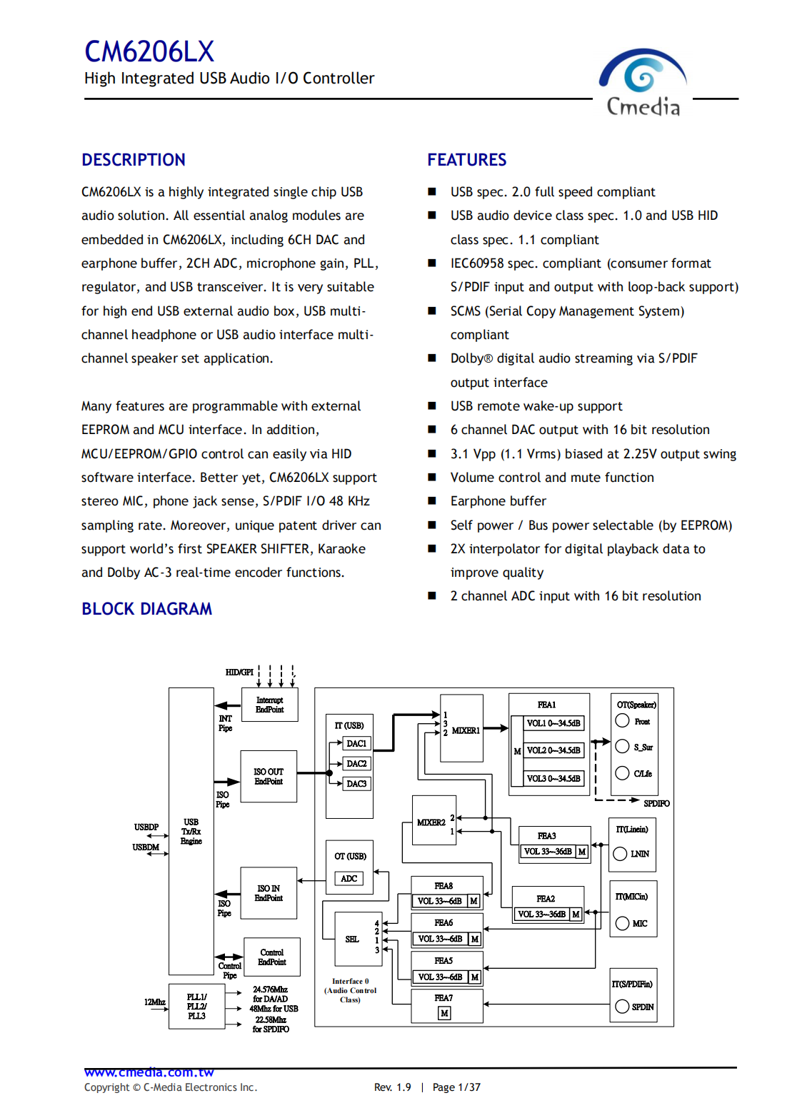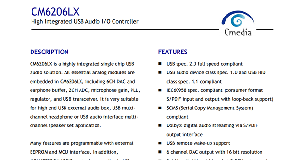 CM6206LX is a highly integrated single chip USB audio solution
