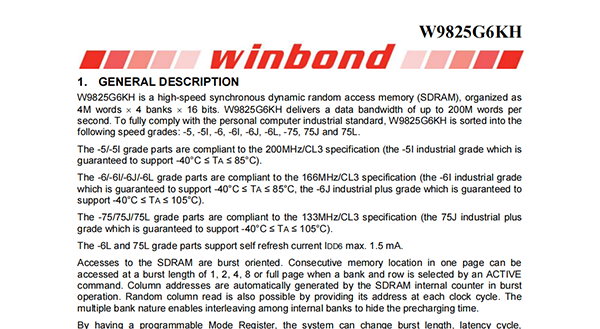 The-6L and 75L grade parts support self refresh current IDD6 max.1.5 mA.Accesses to the SDRAM are burst oriented.Consecutive memory location in one page can be accessed at a burst length of 1,2,4,8 or full page when a bank and row is selected by an ACTIVE command.Column addresses are automatically generated by the SDRAM internal counter in burst operation.Random column read is also possible by providing its address at each clock cycle.The multiple bank nature enables interleaving among internal banks to hide the precharging time.By having a programmable Mode Register,the system can change burst length,latency cycle,interleave or sequential burst to maximize its performance.W9825G6KH is ideal for main memory in high performance applications.