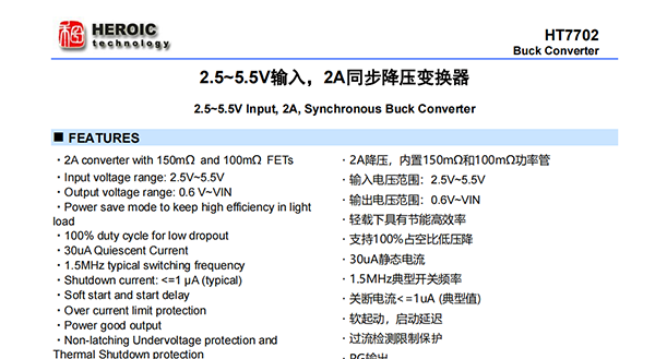 HT7702 是一款 2A同步降壓轉(zhuǎn)換器,具有最 少的外部元件和低關(guān)斷電流