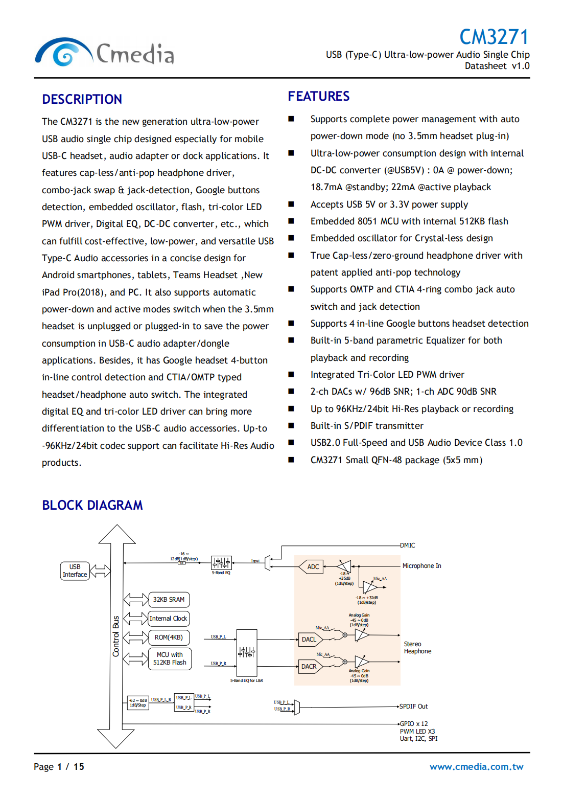The CM3271 is the new generation ultra-low-power USB audio single chip designed especially for mobile USB-C headset,audio adapter or dock applications.It features cap-less/anti-pop headphone driver,combo-jack swap&jack-detection,Google buttons detection,embedded oscillator,flash,tri-color LED PWM driver,Digital EQ,DC-DC converter,etc.,which can fulfill cost-effective,low-power,and versatile USB Type-C Audio accessories in a concise design for Android smartphones,tablets,Teams Headset,New iPad Pro(2018),and PC.It also supports automatic power-down and active modes switch when the 3.5mm headset is unplugged or plugged-in to save the power consumption in USB-C audio adapter/dongle applications.Besides,it has Google headset 4-button in-line control detection and CTIA/OMTP typed headset/headphone auto switch.The integrated digital EQ and tri-color LED driver can bring more differentiation to the USB-C audio accessories.Up-to-96KHz/24bit codec support can facilitate Hi-Res Audio products.