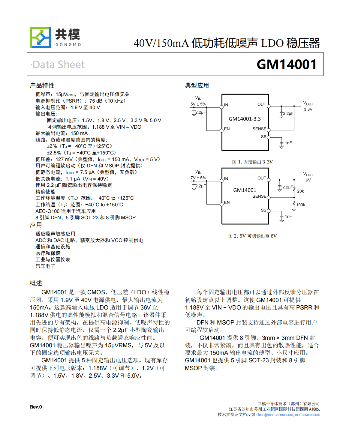 GM14001 是一款 CMOS、低壓差(LDO)線性穩(wěn) 壓器,采用 1.9V 至 40V 電源供電,最大輸出電流為 150mA。