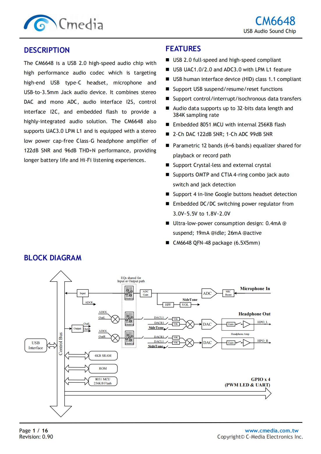 CM6648是一款USB 2.0高速音頻芯,以高性能音頻編解碼器為目標(biāo),高端USB type-C耳機、麥克風(fēng)和USB-to-3.5mm插孔音頻設(shè)備。它結(jié)合了立體聲DAC和單聲道ADC,音頻接口I2S,控制接口I2C和嵌入式閃存,以提供高度集成的音頻解決方案。CM6648還支持UAC3.0 LPM L1,并配有立體聲的低功率無帽G類耳機放大器122dB SNR和96dB THD+N性能,提供更長的電池壽命和高保真聆聽體驗。